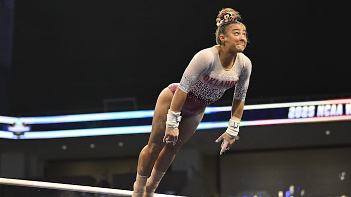 Oklahoma also recorded the highest score nationally on the balance beam (49.675) in the third rotation. Two different Sooners (Fatta and Keira Wells) tied their career bests in leading off the event, and Elle Mueller set a career best score to fuel OU's team win on the apparatus.